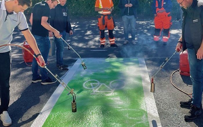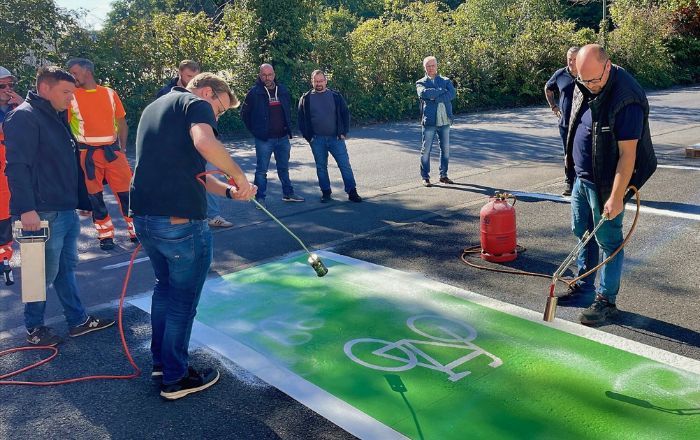 First, the outline of the marking is marked out with chalk on the cleaned surface. If the surface is wet or cold, it must be dried and preheated. A primer is applied for better adhesion. The SWARCO PREFORMED marking is then applied and heated with a gas burner. Optionally, reflective glass beads and grip agents can be sprinkled on afterwards. After a successful adhesion test, the marking is cleaned with a broom to remove any excess grit.