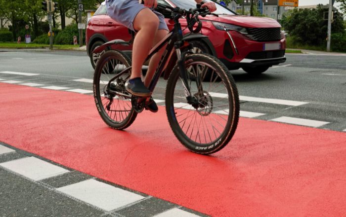 Zebra crossings and bike lane markings are heavily used areas in road traffic. If their surface becomes too smooth, a single misstep or a slipping wheel can have serious consequences. That is why their skid resistance is not a technical detail, but of crucial importance – especially for vulnerable road users. Of course, motorists also benefit from anti-skid markings as well: for example, at stop lines, in bends, or when changing lanes – wherever precise braking, sufficient traction and safe handling are required.