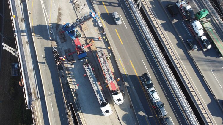 One of the greatest challenges was installing the longest overhead structure of the entire project: the crossbeam of the sign bridge with a span of 43 meters and a weight of around 40 tons. The massive steel beam was delivered in four parts and preassembled by SWARCO during installation week using nearly 200 high-strength (HV) bolted connections. Each HV bolt was tightened to 800 Nm. For comparison, a car wheel bolt is typically tightened to around 120 Nm. For the actual lifting operation, SWARCO used heavy equipment, including two 250-ton mobile cranes that hoisted the beam into its final position in a precisely coordinated tandem lift—an operation where every single movement had to be perfect.