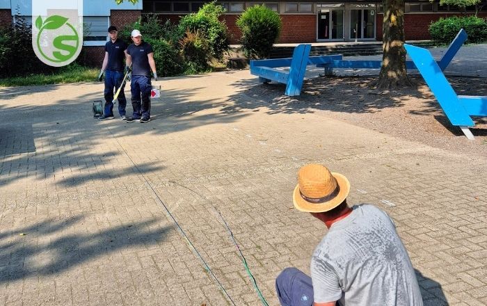 Thermoplastic materials have been used for road markings since the 1950s. Thanks to continuous development, this kind of material is used today all over the world as durable and economical markings. Their durability also makes them the ideal choice for the school playground in Herten. The hot plastic, heated to almost 200 degrees and containing reflective glass beads, was applied to the school playground using the marking machine that normally does its job on Germany's roads. It took some skill and expertise to mark the roundabout properly with the heavy equipment at the narrow site.