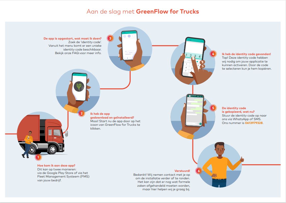 Volg het stappenplan op deze site. De GreenFlow App vind je in de Google Play Store of via jouw Fleet Manager systeem / on-board unit. Na installatie kan de Identity code via SMS of WhatsApp verstuurd worden.