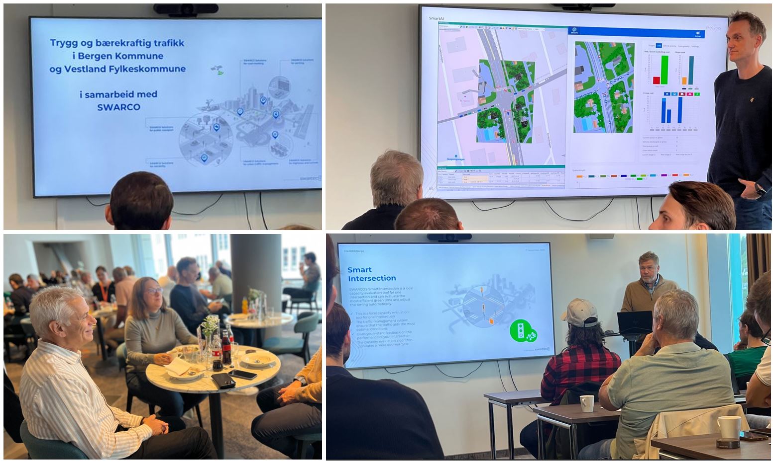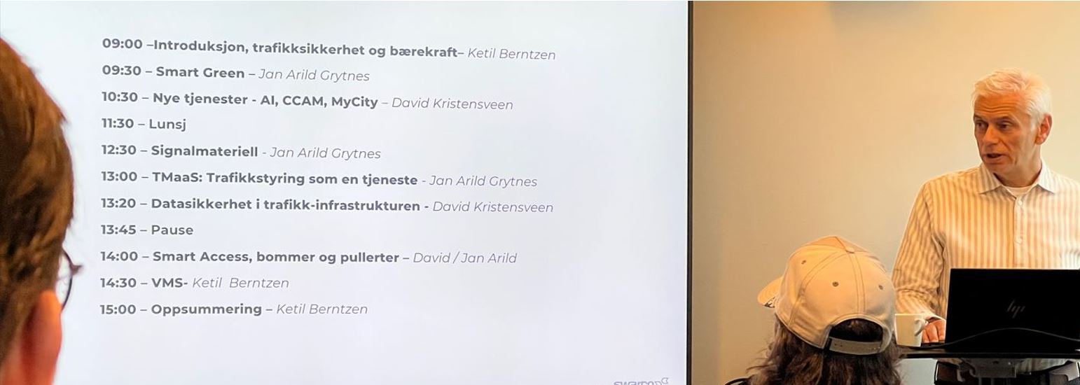 Våre eksperter presenterte SWARCOs portefølje med tydelig bærekraftsperspektiv og verdiøkende tjenester. Fokuset lå på hvordan relativt enkle grep med intelligent ITS kan bidra til å løse gjengangere som kø, kapasitetsutfordringer og miljøbelastning.