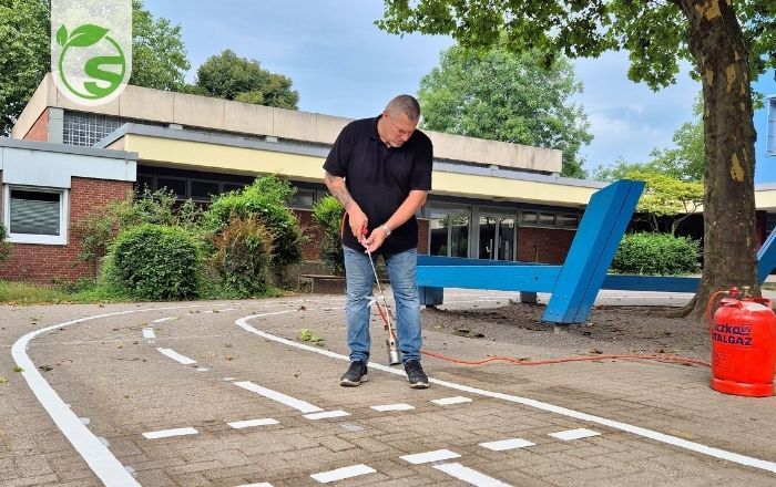 Thermoplastic materials have been used for road markings since the 1950s. Thanks to continuous development, this kind of material is used today all over the world as durable and economical markings. Their durability also makes them the ideal choice for the school playground in Herten. The hot plastic, heated to almost 200 degrees and containing reflective glass beads, was applied to the school playground using the marking machine that normally does its job on Germany's roads. It took some skill and expertise to mark the roundabout properly with the heavy equipment at the narrow site.